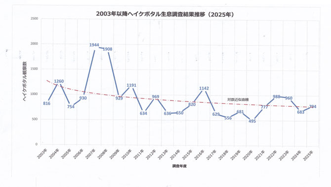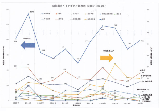 今年は、市内9か所で延べ15回の調査を実施しました。出現数は653匹、減少幅が大きくなっています。(文責:晝間)